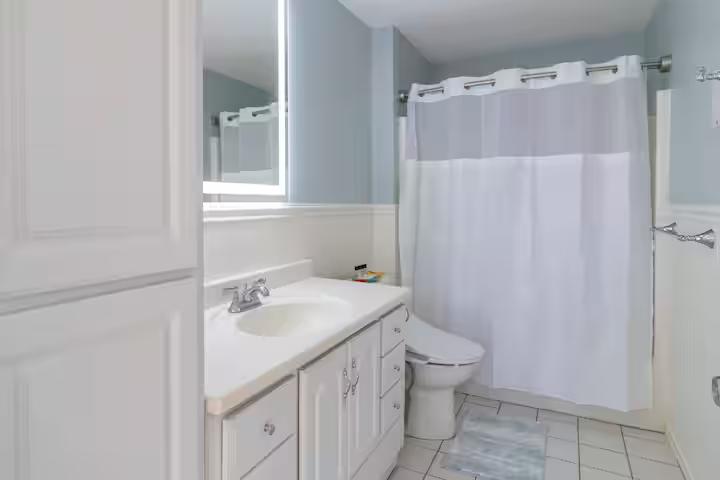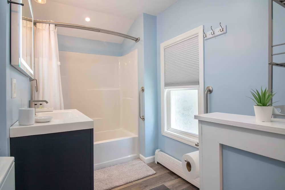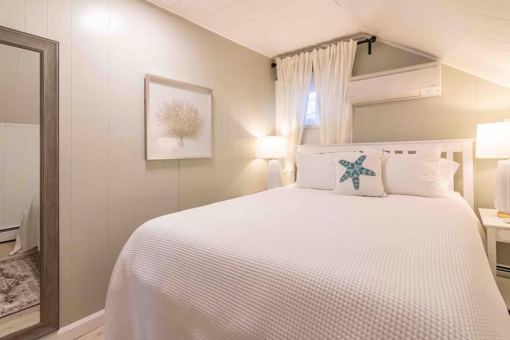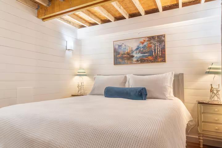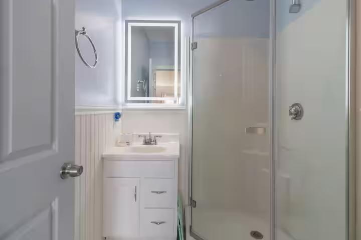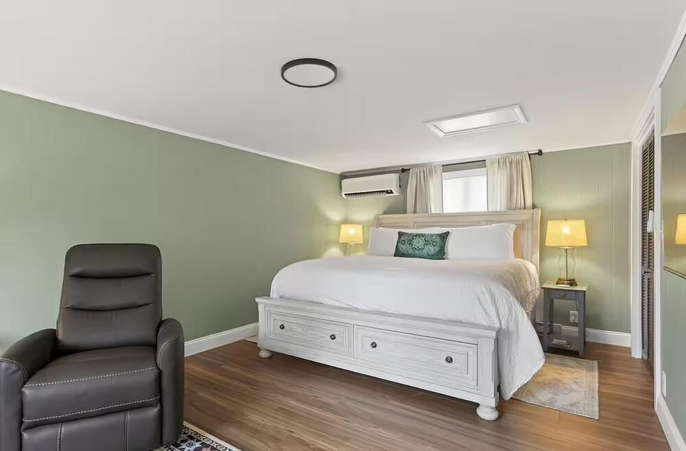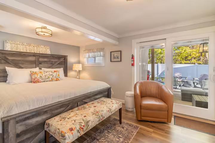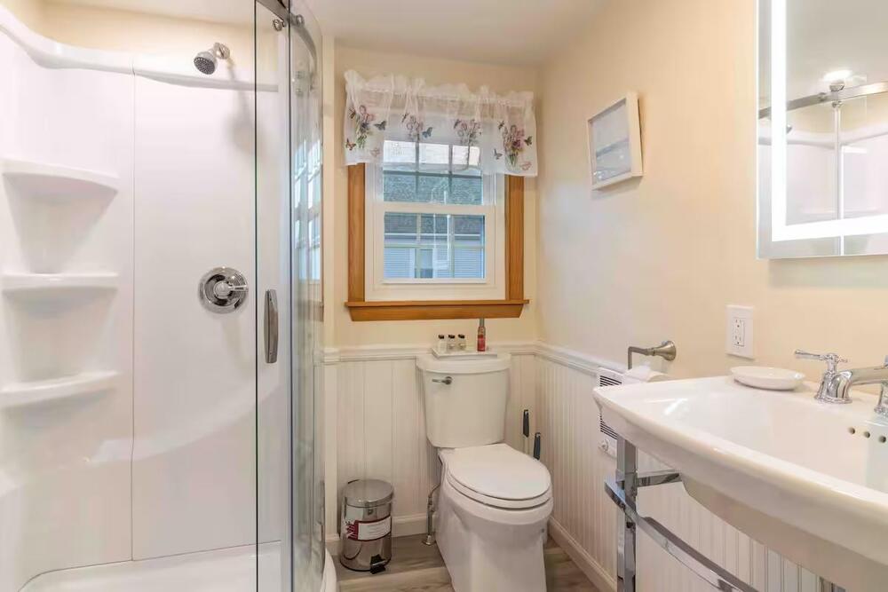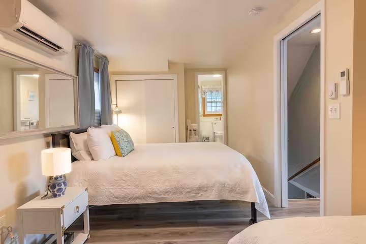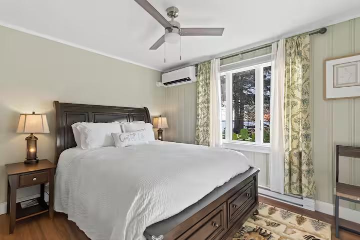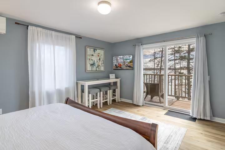 The Upper Level of this vacation home features two bedrooms. The master bedroom has an expansive picture window of the Somes. The Master Bedroom features king size bed, ensuite bath (walk in shower, vanity, toilet), smart tv, and comfortable power Leather Italia loveseat. The second bedroom has queen beds and an en-suite bath (walk in shower, vanity, toilet).
