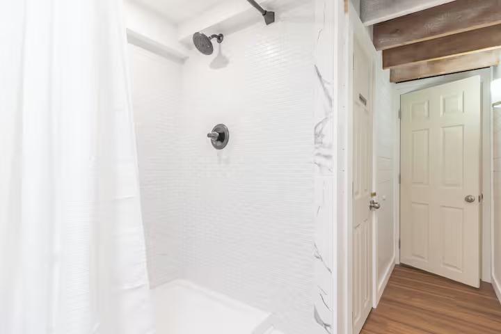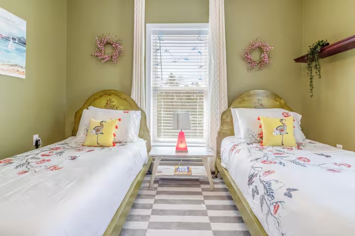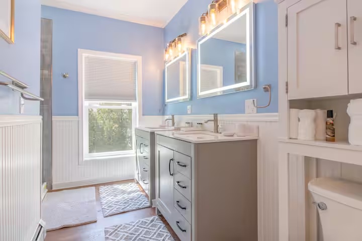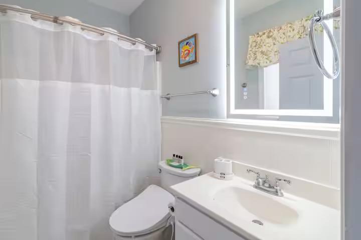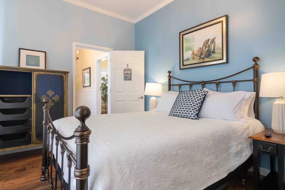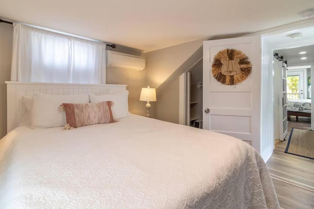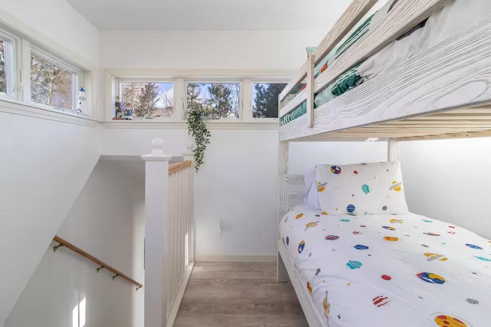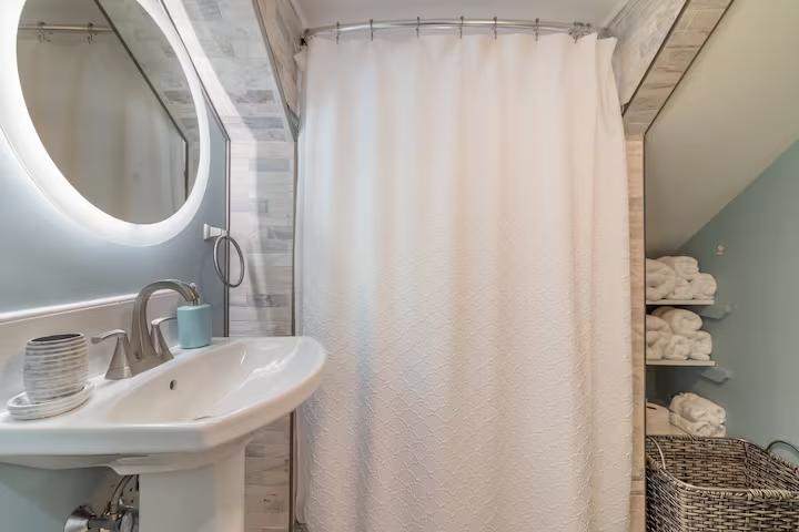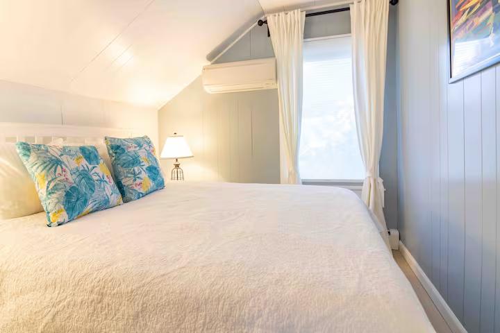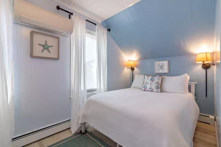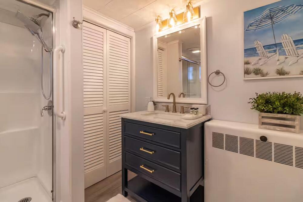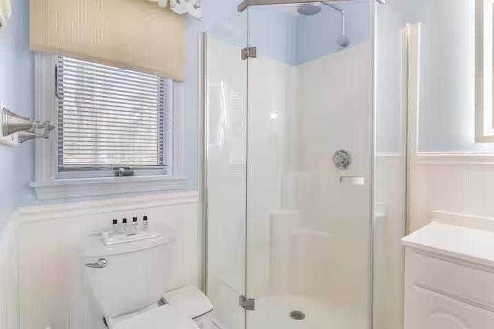 The Upper Level of this vacation home features two bedrooms. The master bedroom has an expansive picture window of the Somes. The Master Bedroom features king size bed, ensuite bath (walk in shower, vanity, toilet), smart tv, and comfortable power Leather Italia loveseat. The second bedroom has queen beds and an en-suite bath (walk in shower, vanity, toilet).