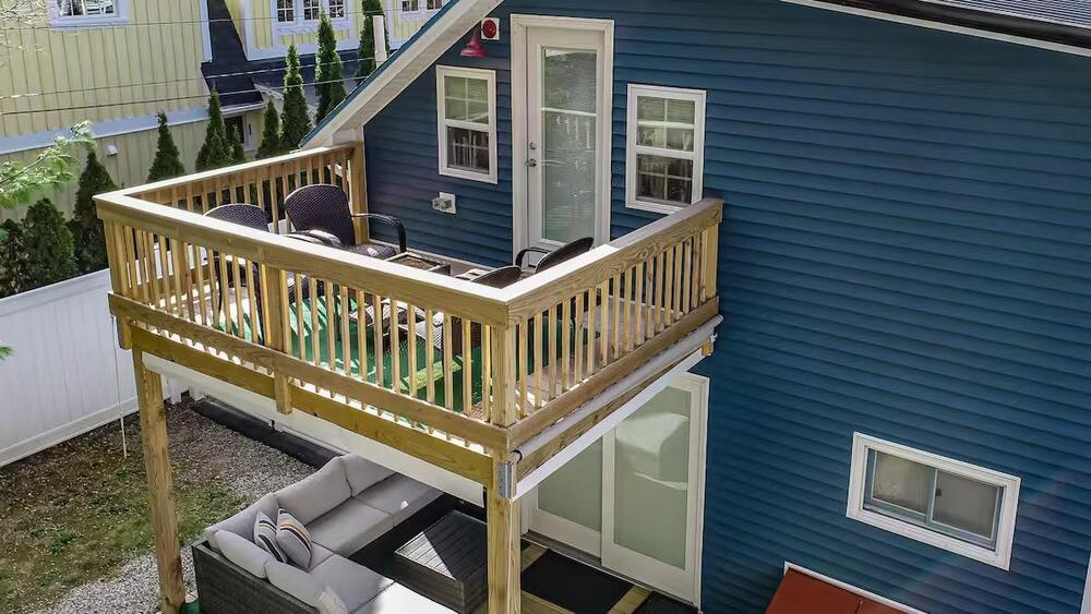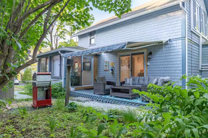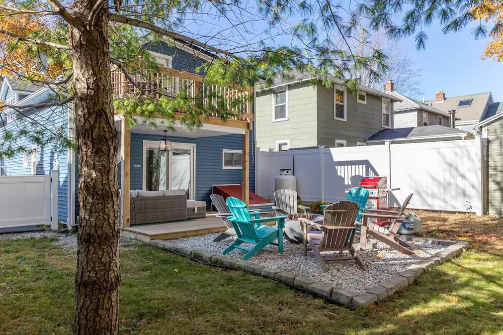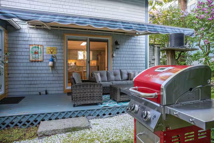 The backyard features propane fire pit with comfortable polywood Adirondock chairs. A private wharf with gangway to the float for easy access to the water. The waterfront is tidal. There's complimentary Kayaks. There are life vests for guest to use. They are complimentary. The wharf has outdoor dining table with seating for 8 with the propane fired grill right next to it.